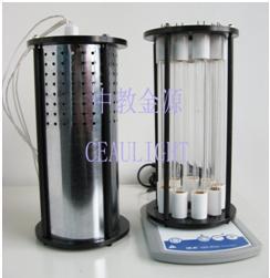 环照式光化学反应系统(CEL-UV9),反应装置周围可以选择3-9只灯管,增加反应液的照射强度和照射面积,反应装置采用磁力搅拌或电动搅拌均可以。该系统一般应用到低压汞灯系统,可以选择波长185nm,254nm。